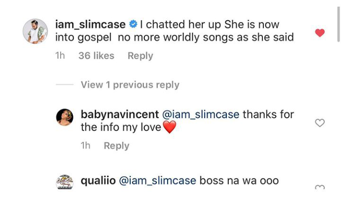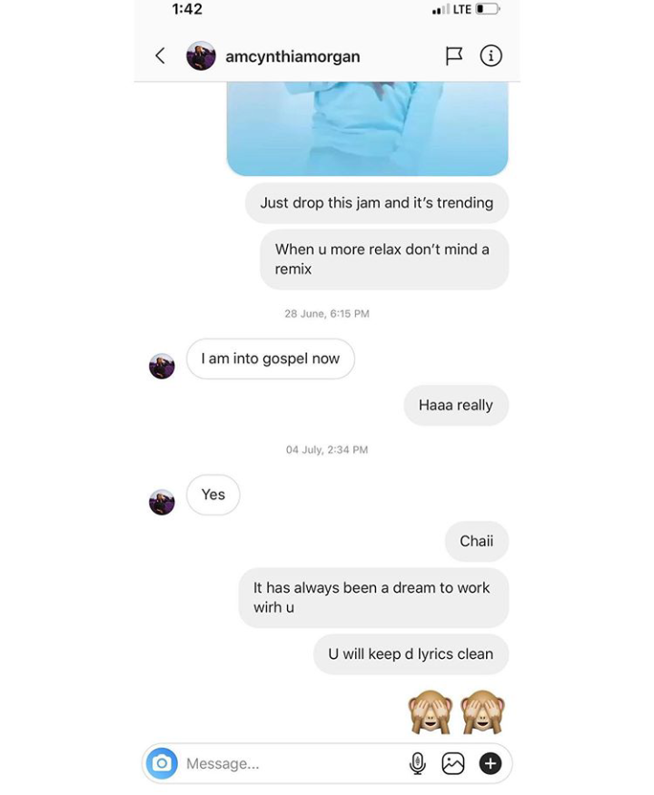 According to the alleged conversation posted by GossipMill, Cynthia Morgan after rejecting to feature in the remix told Slim Case that she is now into gospel songs only.