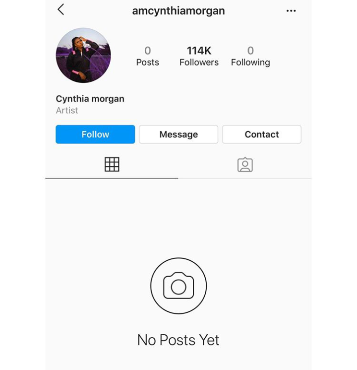 However, a quick visit to Cynthia Morgan’s Instagram page showed that she has deleted every post and has left her page blank, probably set to begin a new chapter.